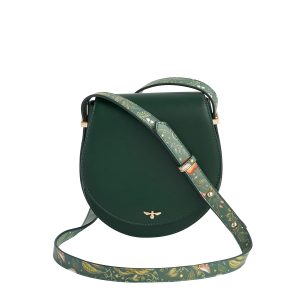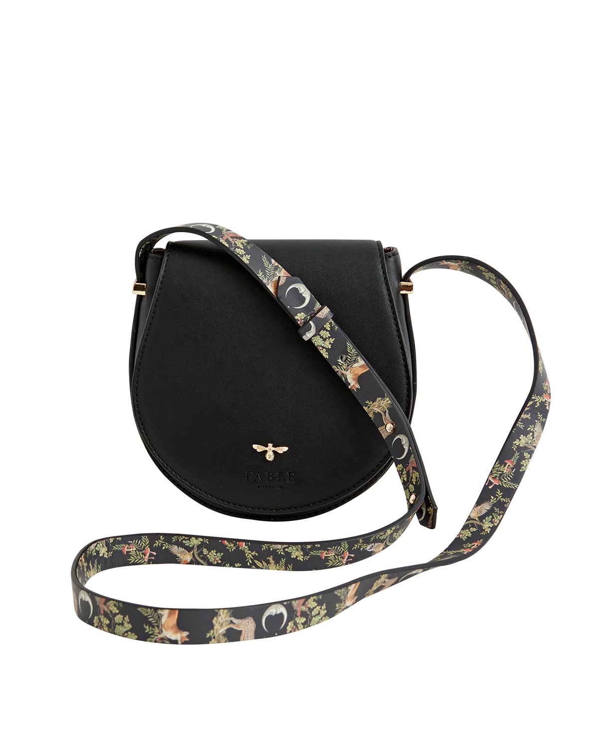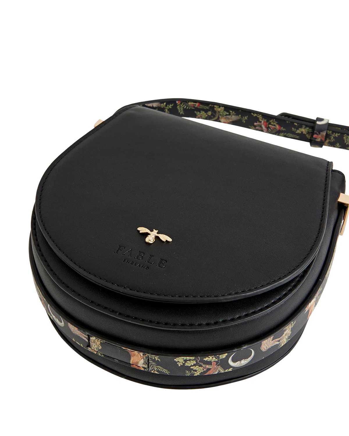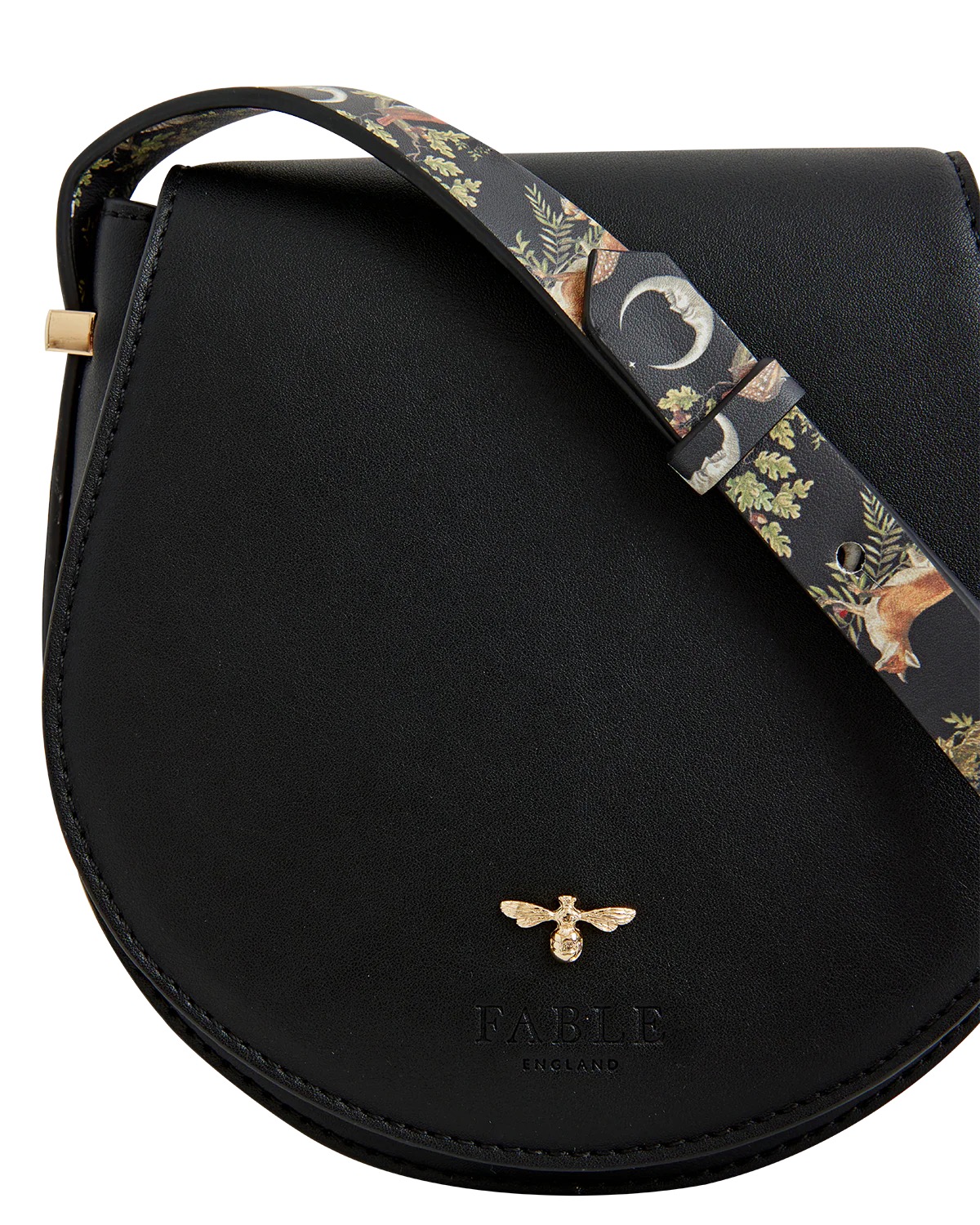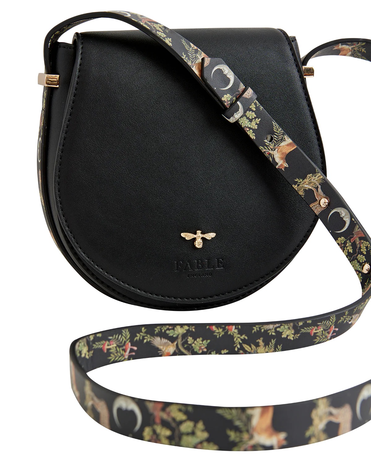 Un modello classico ma con un tocco davvero speciale. La silhouette curva richiama le tradizionali “saddle bag” equestri, ma qui c’è un twist magico: la stampa applicata sulla tracolla.