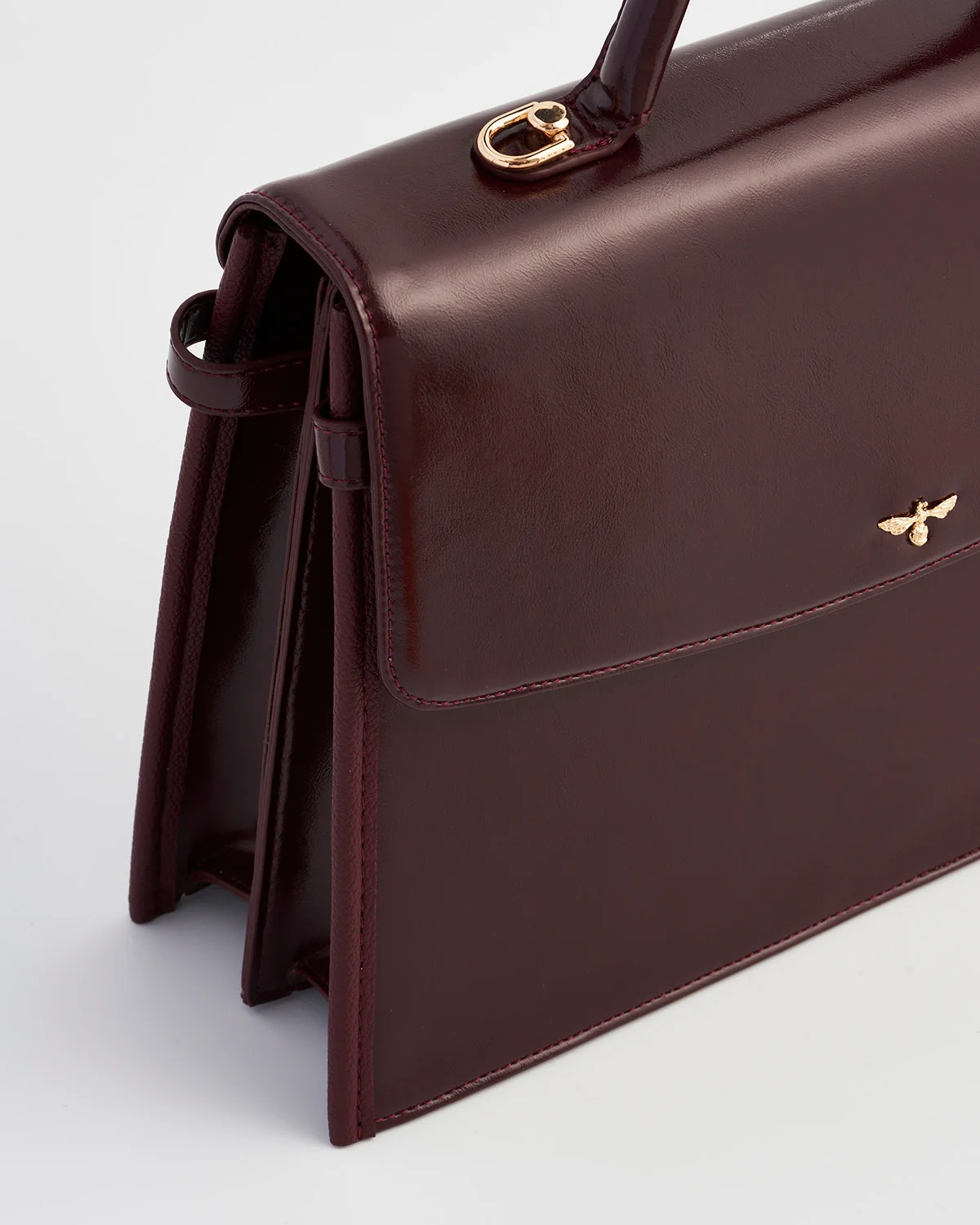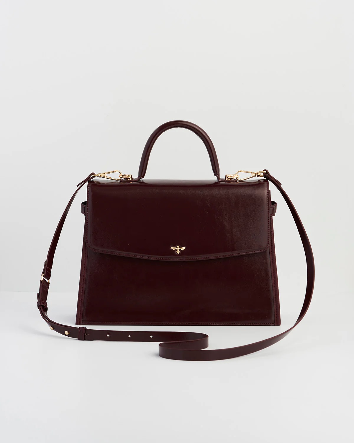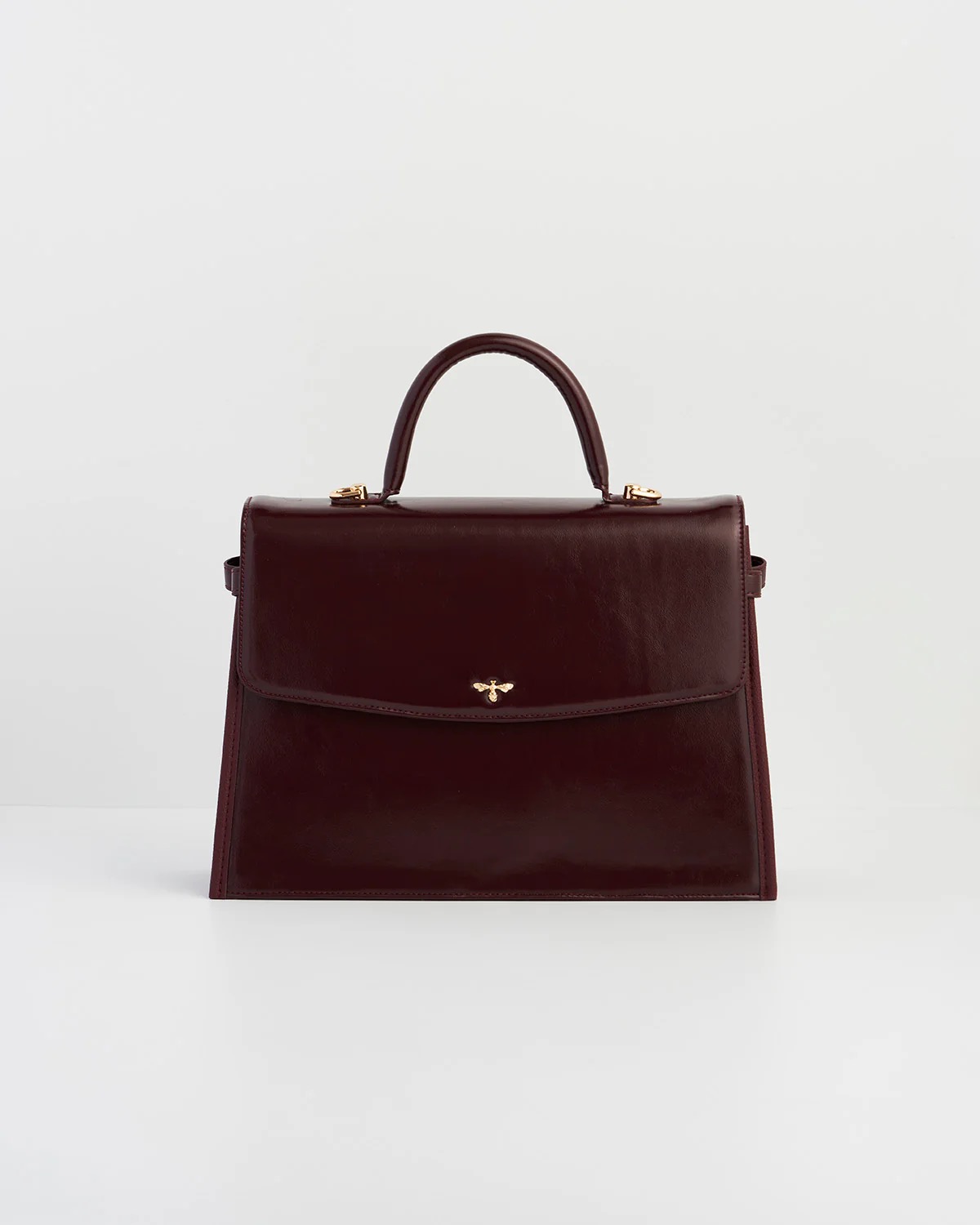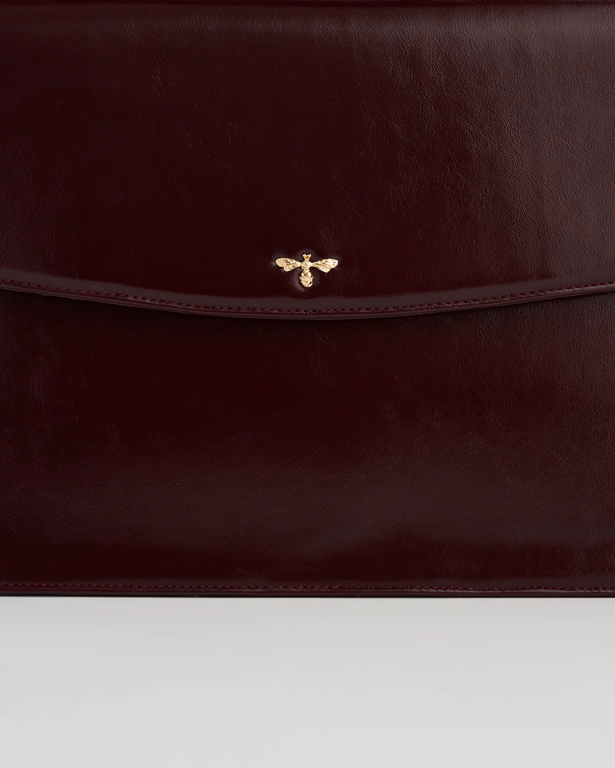 Realizzata con una pelle vegana morbidissima, questa tote presenta una forma strutturata con manici comodi, tracolla regolabile e l’immancabile placca dorata con ape. L’interno è studiato per essere super pratico perché composto da due scomparti, una tasca interna con zip, tre slot porta arte e la possibilità di allargarla attraverso un piccolo bottoncino.