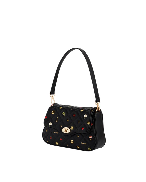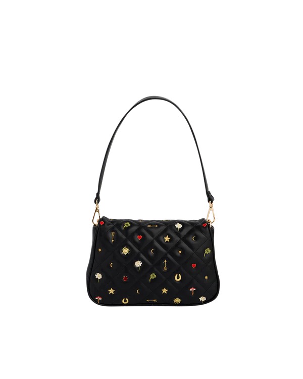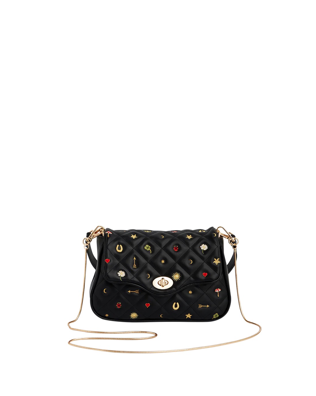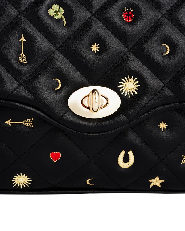 Questa lussuosa borsa è decorata con vivaci motivi ricamati, tra cui stelle, lune, ferri di cavallo, cuori, soli e portafortuna, distribuiti sull’elegante motivo a diamante trapuntato.