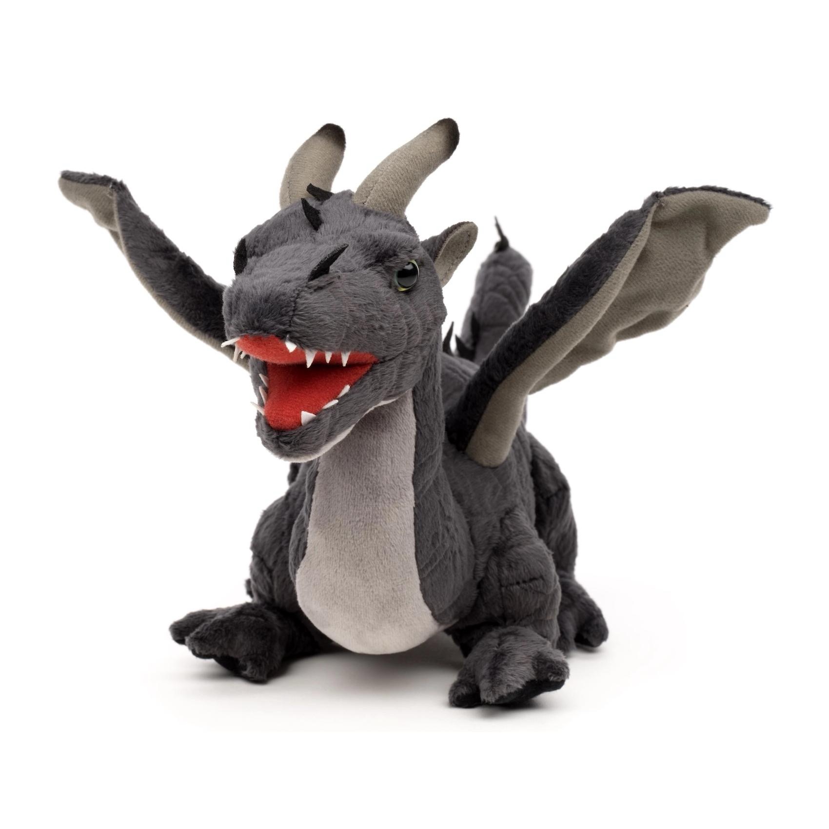 Entra in un mondo di leggende e magia con questo straordinario drago grigio di peluche.