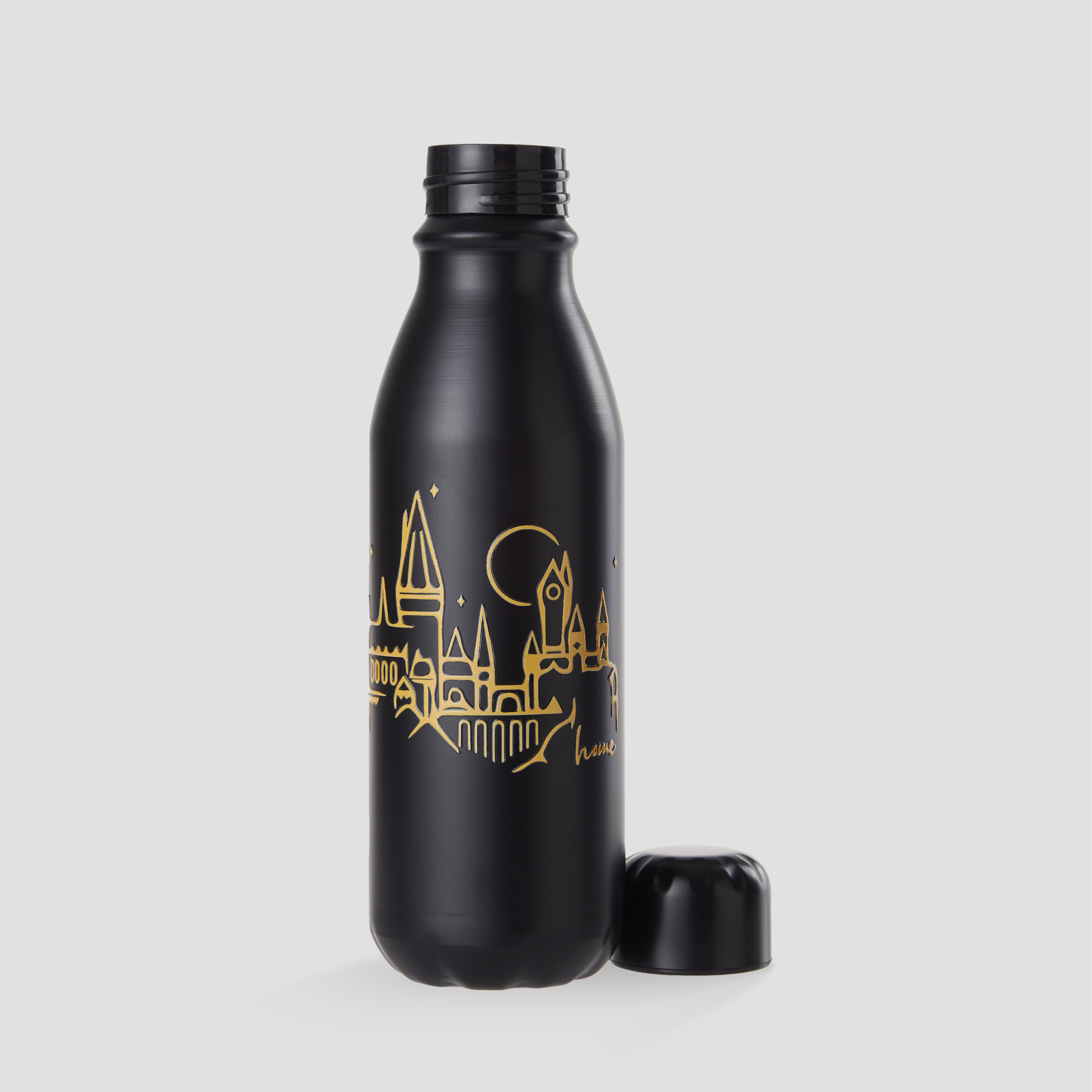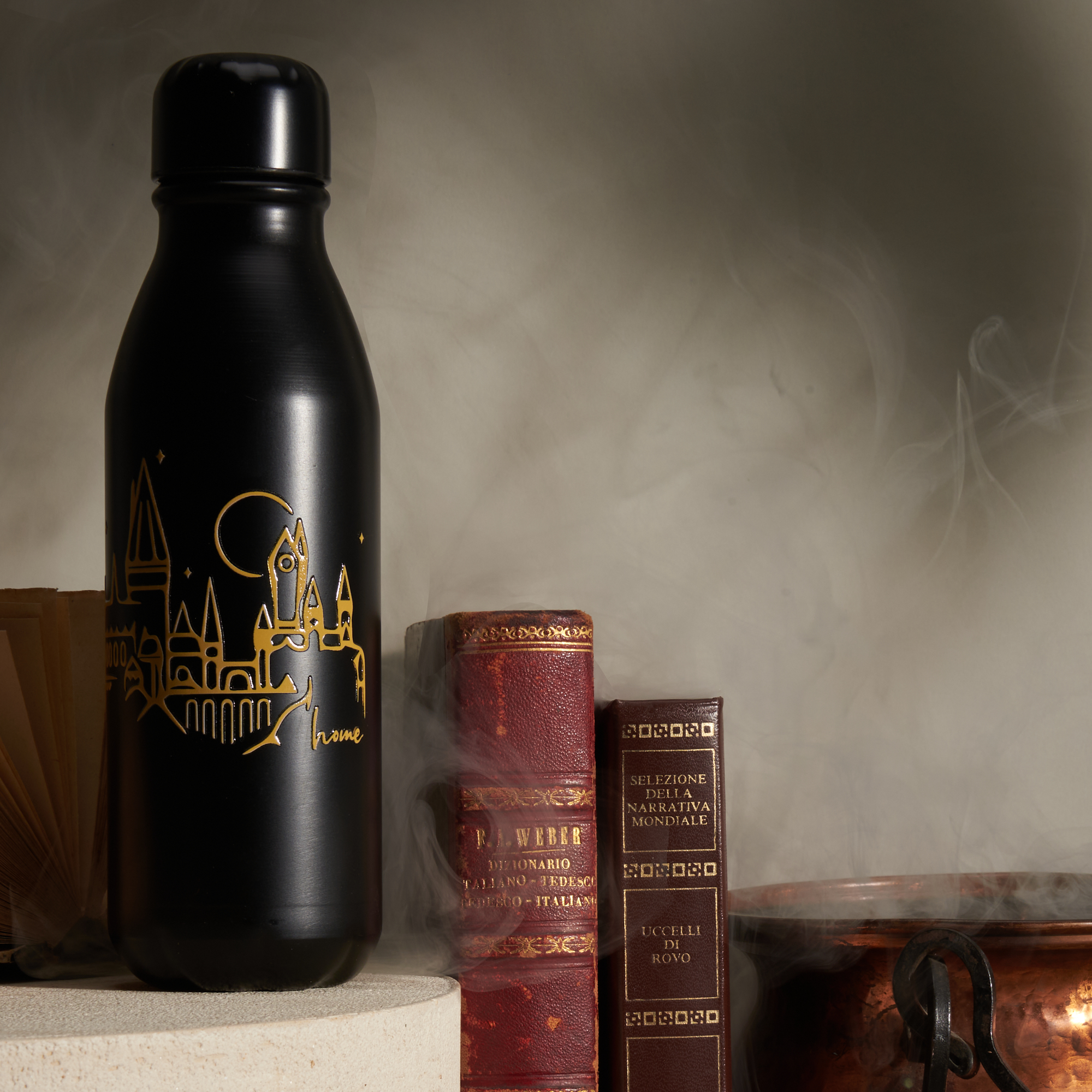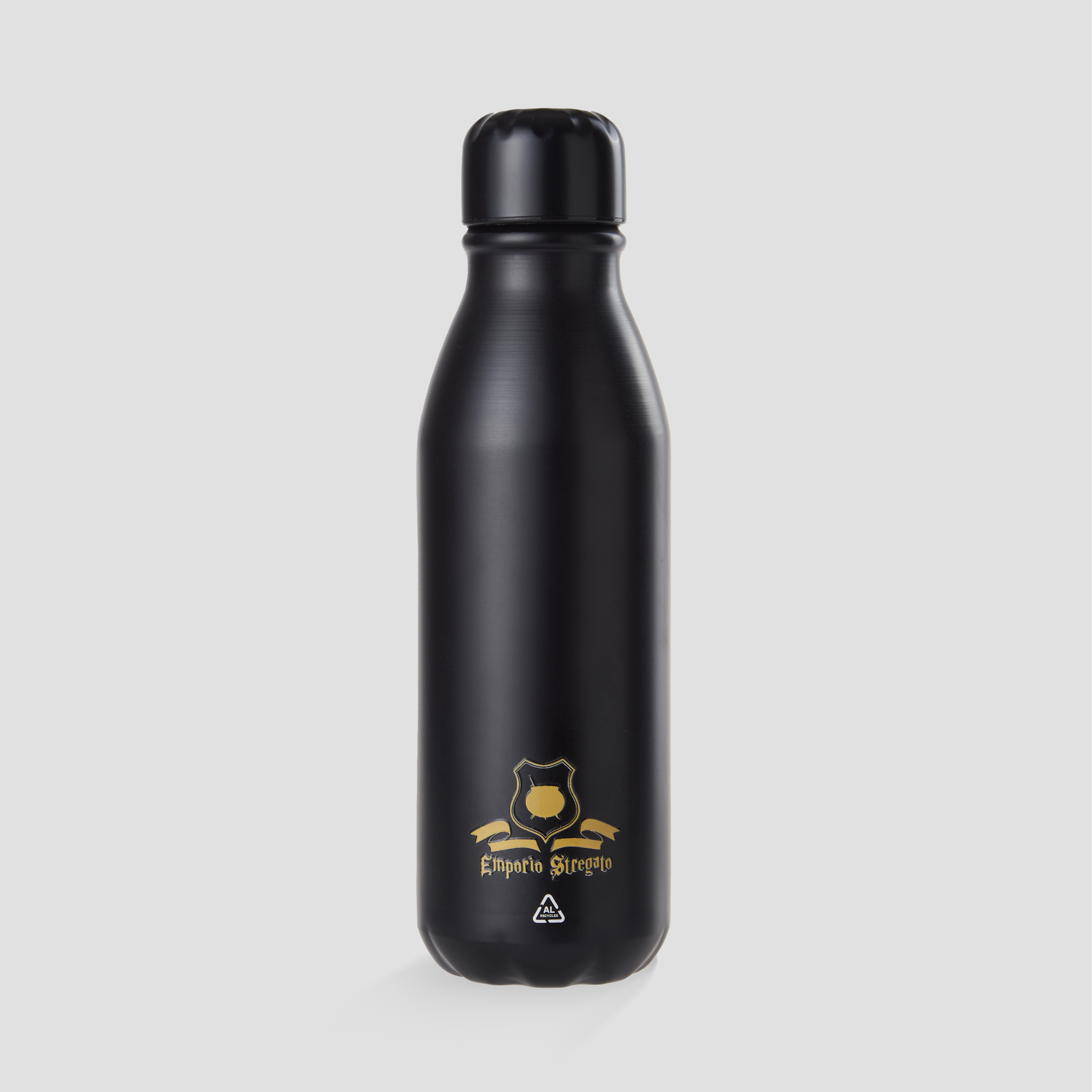 Realizzata in alluminio riciclato, è leggerissima e super pratica, perfetta da portare ovunque: a scuola, a lavoro, in viaggio o durante le tue avventure quotidiane. La finitura nera opaca la rende elegante e sofisticata, mentre la grafica dorata del castello Emporio Stregato, il nostro simbolo distintivo, la trasforma in un oggetto unico e riconoscibile.