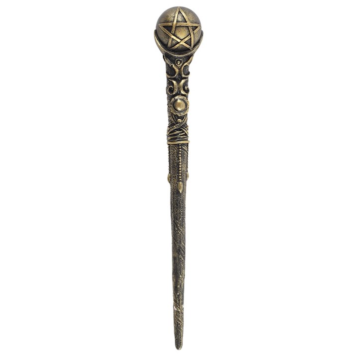Questa bacchetta in resina da 24 cm è impreziosita da una raffinata sfera color bronzo decorata con un simbolo del pentagramma, posizionata sulla sommità di un manico riccamente ornato e dettagliato.